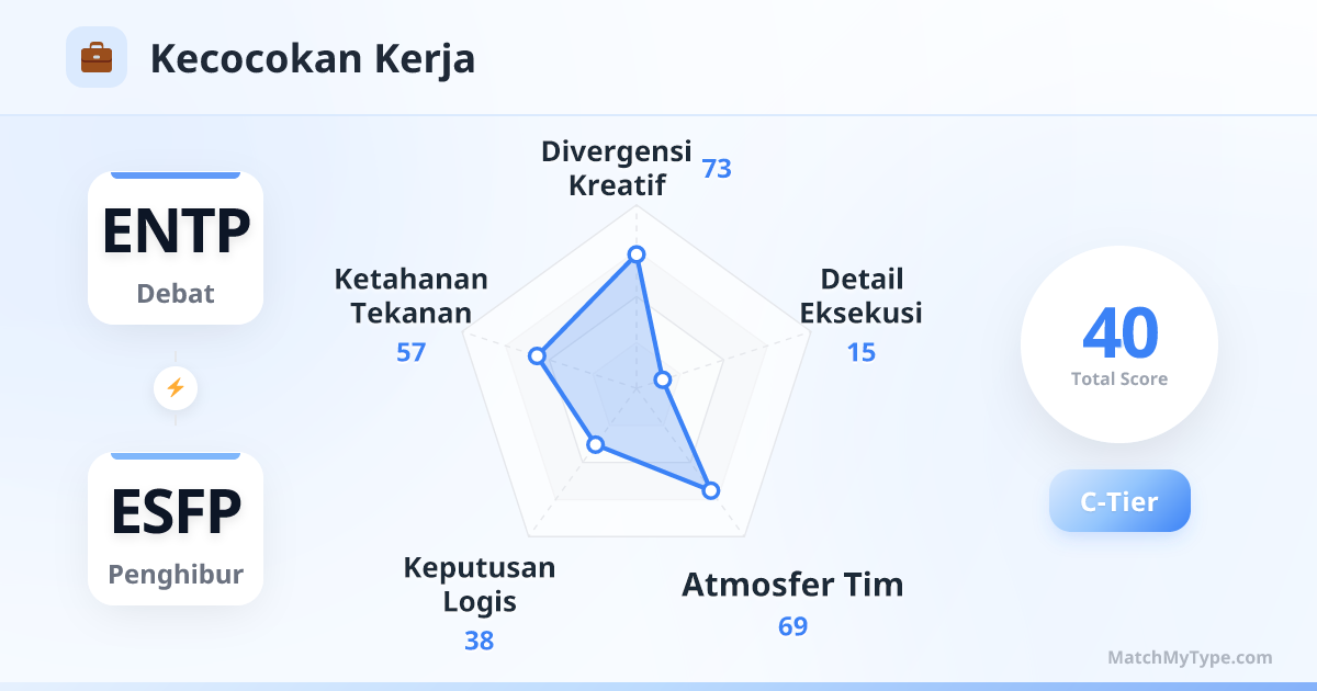 Teman untuk bermalas-malasan. Jika duduk bersama, Anda mungkin akan bergosip dan membicarakan ide baru sepanjang hari, dengan efisiensi nol. Disarankan isolasi fisik: ENTP bertanggung jawab atas strategi di balik layar, ESFP bertanggung jawab atas resepsionis atau penjualan di depan. Saat bekerja sama, pastikan ajak rekan ISTJ atau INTJ untuk bertanggung jawab atas pencatatan dan eksekusi.