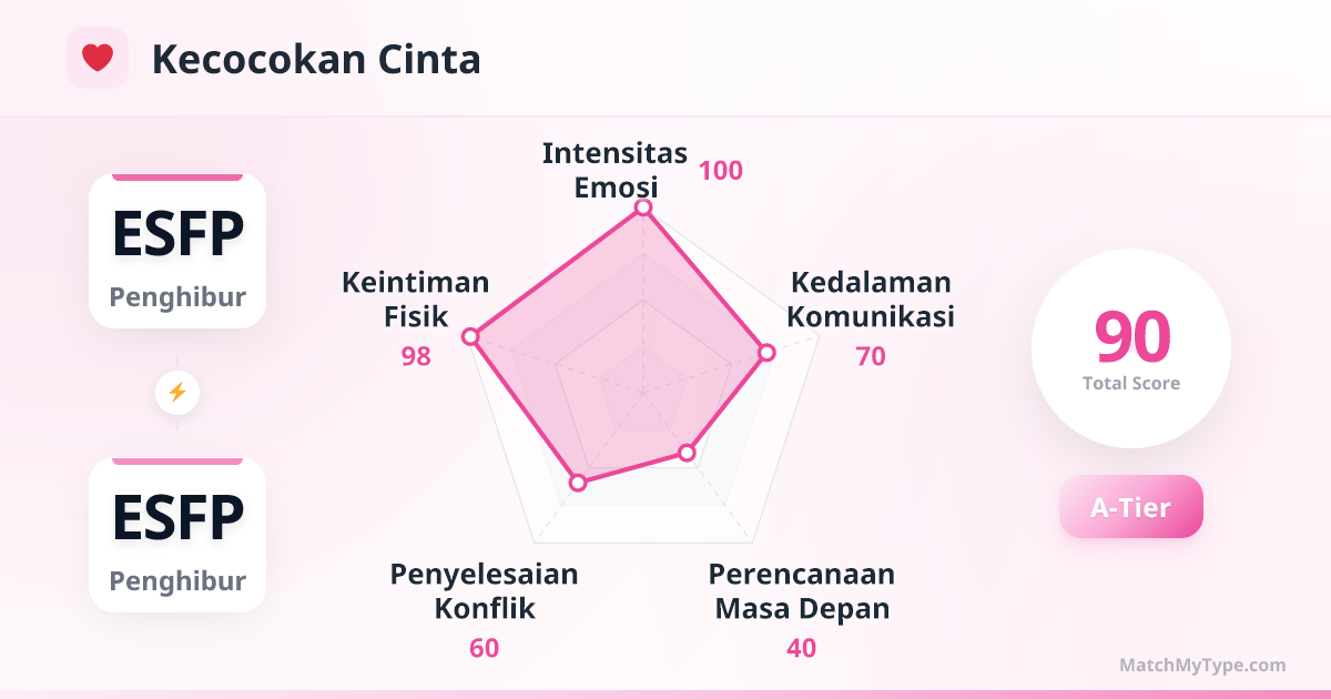 Siklus energi tanpa batas. Satu ESFP saja bisa meramaikan suasana, dua ESFP bisa meruntuhkan atap. Kalian akan saling mendukung dalam pesta, membawa suasana ke puncaknya. Selain itu, hanya sesama ESFP yang bisa memahami penyamaran sosial 'meskipun aku tertawa, sebenarnya aku lelah', dan menemani kalian melepas topeng serta mengeluh setelah acara selesai.