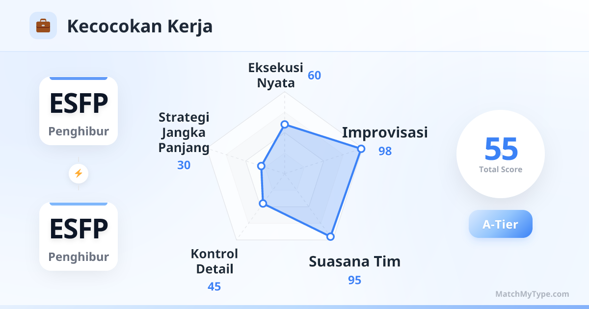 Sama seperti di atas. Jika atasan dan bawahan sama-sama ESFP, ketakutan terbesarnya adalah menjadi 'terlalu akrab' sehingga batasannya kabur. Jam kerja diisi dengan bergosip, sepulang kerja minum bersama, dan akhirnya pekerjaan tidak ada yang menyentuh. Perlu membangun batasan profesional.