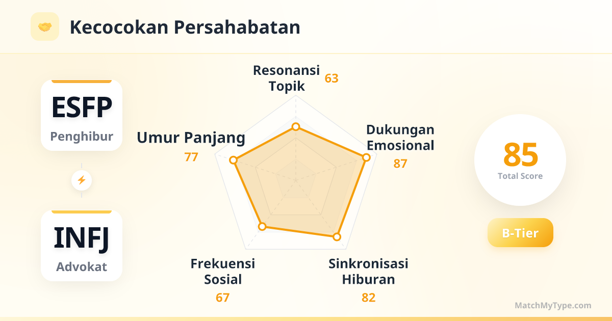 Ini adalah pasangan 'komplementer' yang tipikal. ESFP bagaikan sinar laser warna-warni yang tiba-tiba masuk ke dunia kelabu INFJ, sementara INFJ adalah pelabuhan tenang yang didambakan ESFP setelah kehidupan yang bising. Daya tarik ini sering dimulai dari rasa ingin tahu, tetapi membutuhkan kesabaran besar untuk dipertahankan.