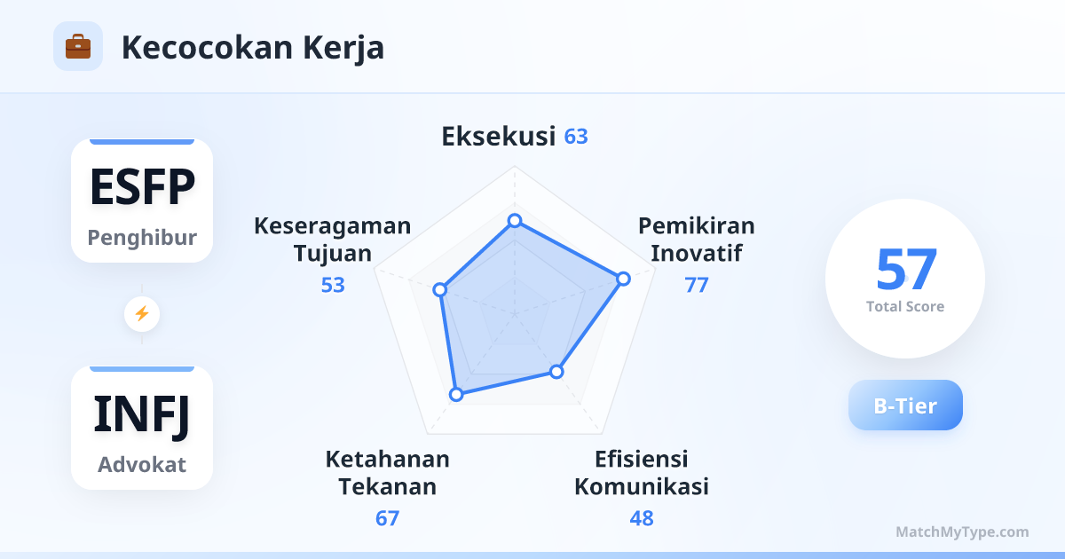 Ketidakselarasan dimensi komunikasi. ESFP mengutamakan 'cepat, sekarang, konkret', INFJ mengutamakan 'stabil, masa depan, makro'. Saat rapat, ESFP mungkin merasa teori INFJ tidak membumi, INFJ akan merasa ESFP berpikiran sempit dan hanya peduli pada keuntungan sesaat. Selain itu, keduanya kurang memiliki Te (eksekusi efisien dan kritik logis), sehingga proyek mudah terjebak dalam kekacauan atau masalah hubungan antarmanusia.
