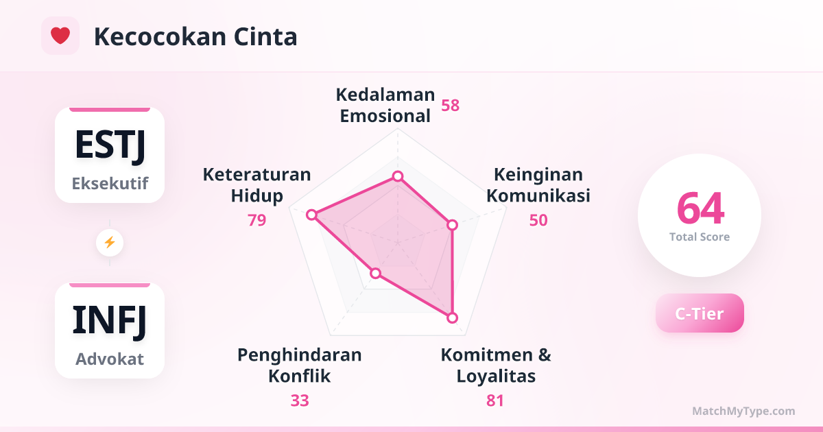Ini adalah 'Pasangan Emas' di tempat kerja. ESTJ menyediakan kerangka, INFJ memberikan jiwa. Selama tujuannya selaras, kalian bisa membangun imperium bisnis yang memiliki sistem ketat sekaligus budaya yang hangat.