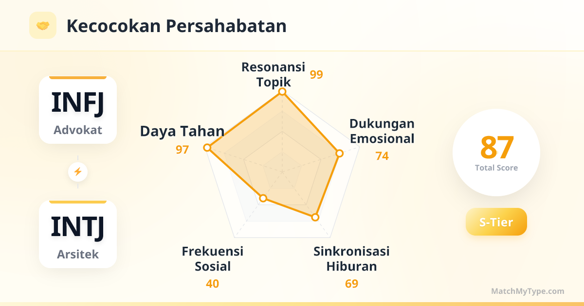 Saat intuisi terdalam (INFJ) bertemu dengan logika terketat (INTJ), ini adalah pasangan dengan kepadatan IQ tertinggi dan paling sedikit omong kosong di alam semesta MBTI. Anda adalah satu-satunya 'jenis yang sama' di tengah keramaian.