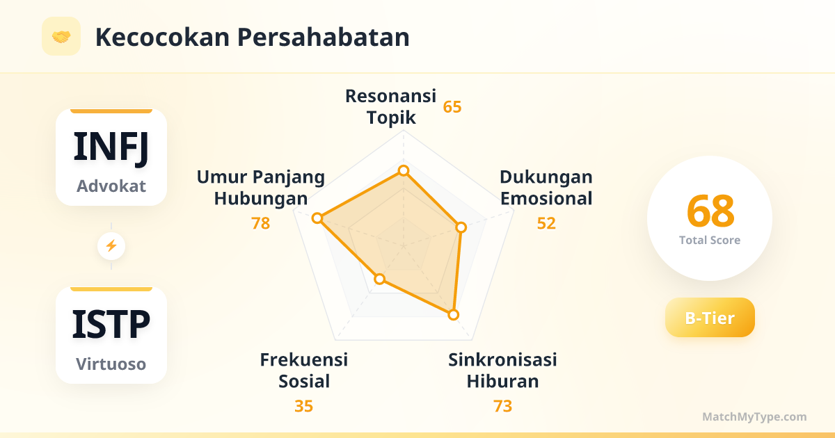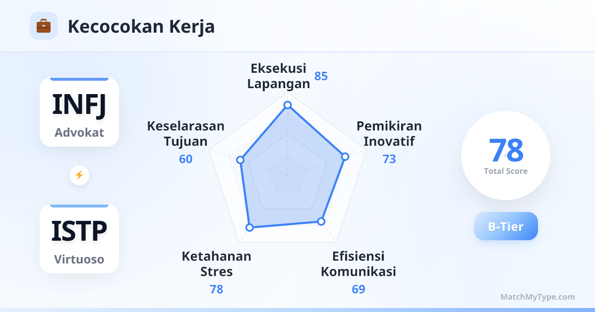 Ini adalah kombinasi antara 'Ahli Strategi' dan 'Pasukan Khusus'. INFJ ahli dalam strategi makro, memahami orang, dan memprediksi krisis; ISTP ahli dalam eksekusi taktis, mengatasi masalah teknis, dan improvisasi di lapangan. Selama tujuannya sama, Anda berdua bisa menangani proyek yang paling kompleks.