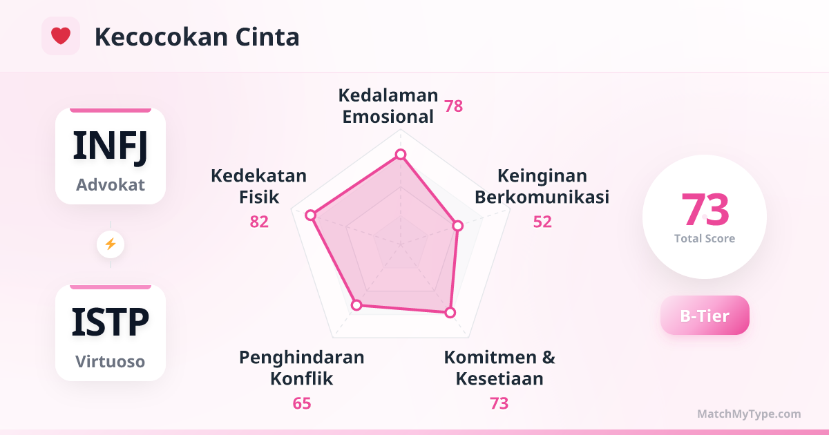 Yang menarik adalah, Anda berdua memiliki empat fungsi yang sama persis tetapi dengan urutan yang terbalik: **Ni (Intuisi Introvert) & Fe (Perasaan Ekstrovert) vs Ti (Berpikir Introvert) & Se (Penginderaan Ekstrovert)**: INFJ terbiasa melihat makna masa depan terlebih dahulu (Ni), baru kemudian mempertimbangkan perasaan orang lain (Fe); sementara ISTP terbiasa menganalisis logika terlebih dahulu (Ti), baru kemudian merasakan stimulasi sensorik saat ini (Se). **Titik Komplementer**: INFJ cenderung melayang di awan dan terjebak dalam siklus kecemasan. Se yang kuat pada ISTP dapat menarik INFJ kembali ke bumi dan memberitahu mereka 'jangan berpikir terlalu banyak, ayo makan dulu'. ISTP cenderung terjebak dalam kehidupan mekanis atau kehampaan emosional; Fe dari INFJ dapat menghangatkan hati mekanis ISTP dan mengajari mereka cara mengekspresikan cinta. **Titik Konflik**: Saat INFJ menginginkan komunikasi emosional yang mendalam (Fe), ISTP mungkin menggunakan logika yang dingin (Ti) untuk menyelesaikan masalah, sehingga INFJ merasa pasangannya 'tidak punya perasaan'.