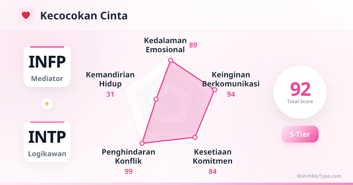 Ini adalah kisah tentang 'robot paling hangat' yang bertemu dengan 'peri paling rasional'. INFP akan terpikat oleh kejujuran murni tanpa hiasan dan kecerdasan tinggi INTP, merasa bahwa mereka adalah satu-satunya orang di dunia yang tidak munafik. Sementara itu, INTP akan terpesona oleh dunia emosional yang kaya dan estetika unik INFP, karena INFP adalah segelintir orang yang bisa mengikuti lompatan berpikir INTP tanpa menganggap mereka 'aneh'. Saat bersama, kalian bisa mengobrol mulai dari mekanika kuantum hingga menu makan malam, dan koneksi intelektual yang mulus ini sangatlah seksi.