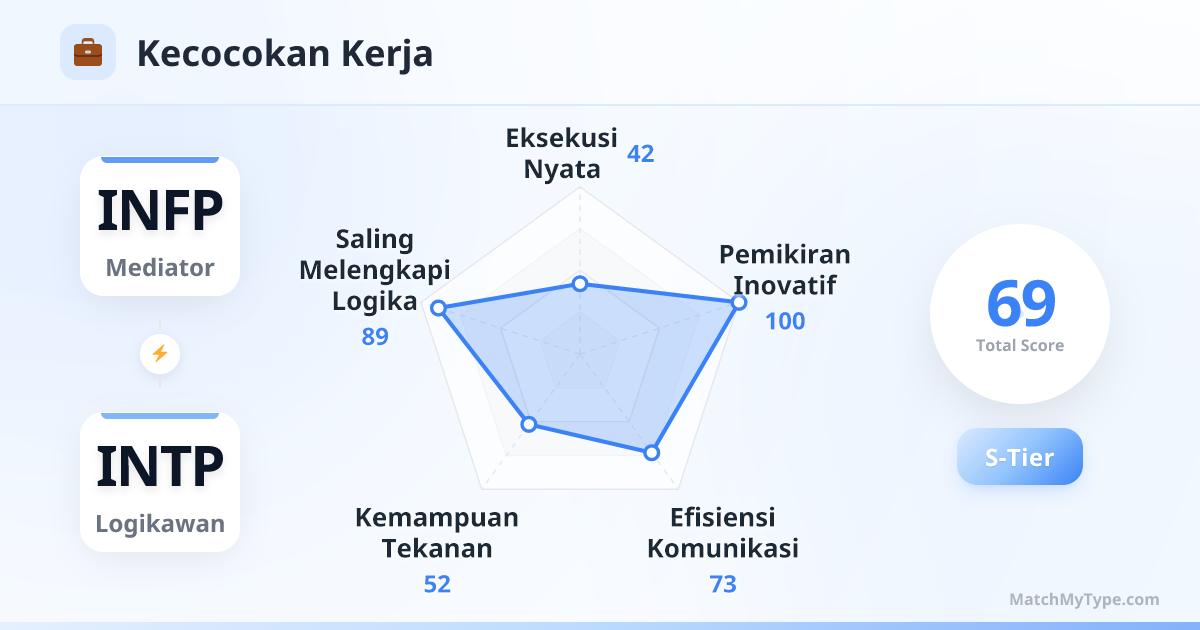 Fusi nuklir pemikiran. INFP memberikan orientasi nilai yang berpusat pada manusia dan intuisi estetika, INTP memberikan arsitektur logika yang ketat dan jalur implementasi teknis. Dalam desain produk, penulisan, kreasi seni, atau riset akademis, kalian dapat menghasilkan karya tingkat atas yang memiliki kedalaman sekaligus kehangatan.