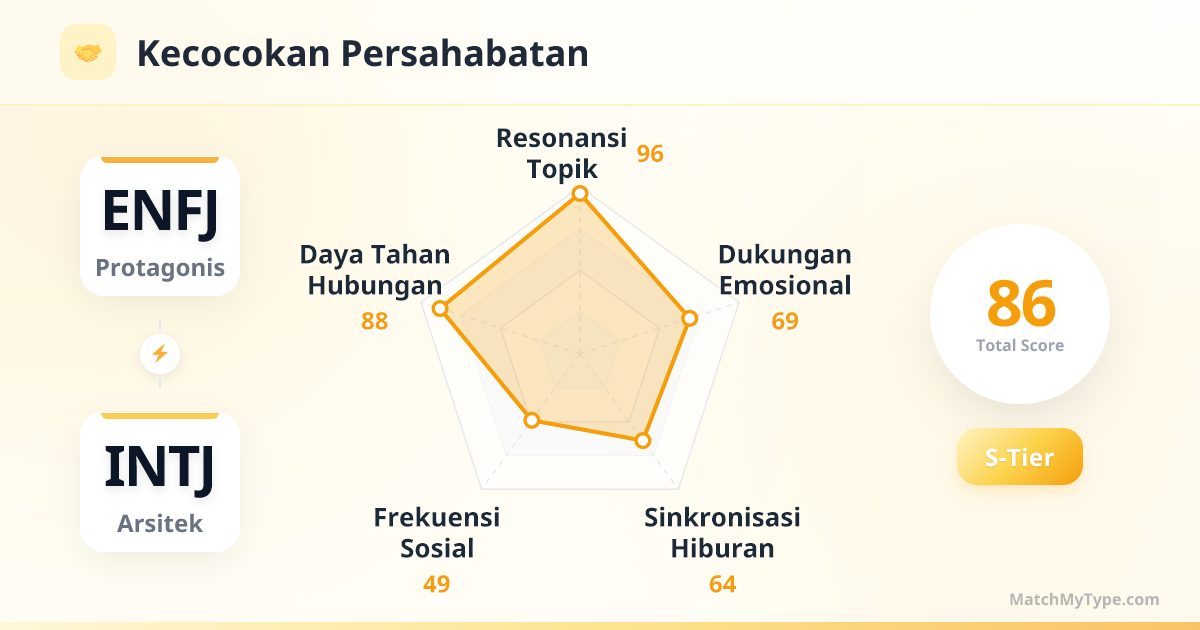 Pasangan emas. Yang satu bertanggung jawab di depan layar (presentasi, negosiasi), yang satu bertanggung jawab di balik layar (perencanaan, data). Selama pembagian tugas jelas dan tidak saling mencampuri bidang profesional masing-masing, efisiensinya sangat tinggi. Ingat: ENFJ jangan mencoba mengajari INTJ cara bersosialisasi, INTJ jangan mempertanyakan logika pidato ENFJ di depan umum.