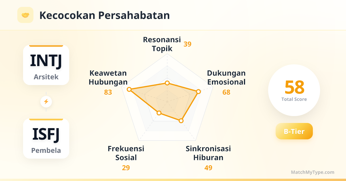 Ini adalah kombinasi 'Strategi + Eksekusi' yang sangat efisien di tempat kerja. INTJ adalah arsitek yang menggambar cetak biru, ISFJ adalah insinyur yang menyusun batu bata satu per satu untuk membangun gedung. Selama INTJ tidak meremehkan kelambatan ISFJ, dan ISFJ tidak meremehkan ide-ide melayang INTJ, kalian bisa menyelesaikan proyek serumit apa pun.