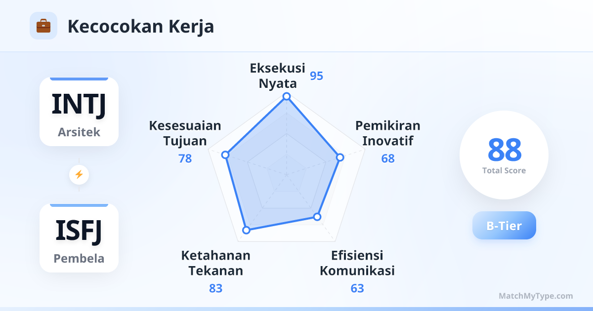 Tekanan tinggi dan Loyalitas. Bos INTJ mementingkan hasil dan efisiensi, selama ISFJ dapat memberikan hasil berkualitas tinggi tepat waktu, INTJ akan sangat menghargainya. Namun, INTJ perlu berhati-hati agar tidak pelit pujian; ISFJ membutuhkan umpan balik positif untuk menjaga motivasi. Jangan hanya bicara saat ada kesalahan.