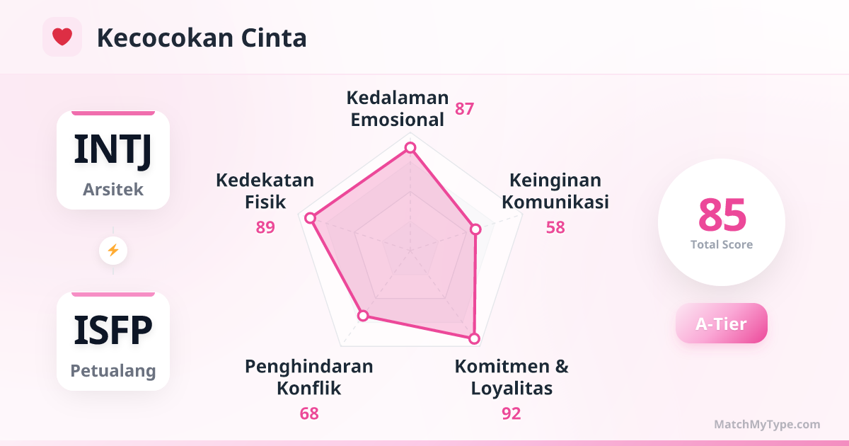 - 2**Perlawanan Pasif ISFP**: Menghadapi konflik, ISFP cenderung menghindar atau diam, yang membuat INTJ yang ingin segera menyelesaikan masalah menjadi frustrasi, bahkan salah mengira bahwa pasangannya tidak peduli.