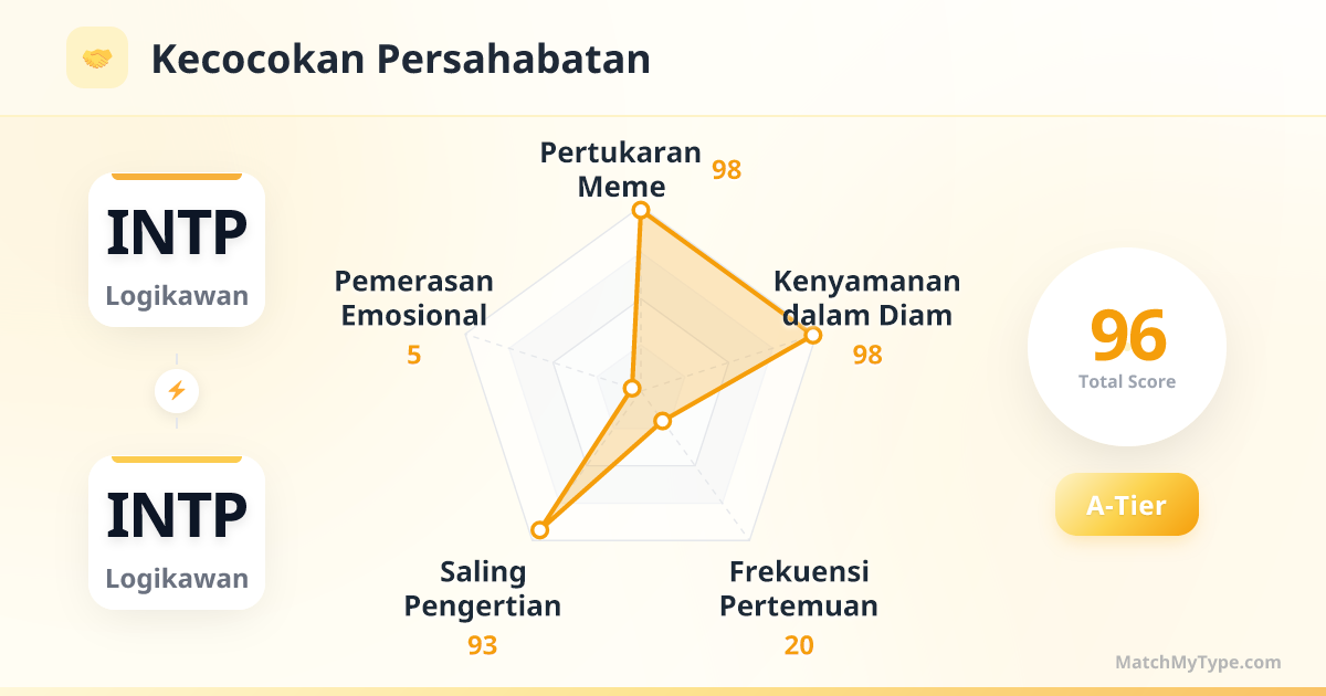Ini adalah resonansi dengan frekuensi yang sama sepenuhnya: **Ti (Introverted Thinking) x Ti**: Dua mesin logika pengejar kebenaran. Dialog Anda seperti seminar akademik yang presisi, terus mengoreksi definisi dan celah logika satu sama lain. Selama kedua pihak tetap objektif, ini akan menjadi pijatan intelektual yang sangat menyenangkan; namun jika salah satu menjadi keras kepala, itu akan berubah menjadi debat tanpa akhir. **Ne (Extraverted Intuition) x Ne**: Pengganda imajinasi. Satu INTP melontarkan asumsi konyol, yang lain bukan membantah, melainkan membangun istana di atas awan dari asumsi tersebut. Anda bisa menghabiskan semalam suntuk membahas "bagaimana peradaban berkembang jika manusia tidak punya jempol", kesenangan yang tidak bisa dipahami orang luar. **Fe (Extraverted Feeling) x Fe**: Ini adalah titik lemah keduanya (fungsi inferior). Keduanya buruk dalam mengekspresikan emosi dan tidak ingin berurusan dengan hubungan interpersonal yang rumit. Sisi baiknya tidak ada yang bersikap tidak masuk akal, sisi buruknya adalah keduanya mungkin memendam perasaan yang mendalam namun wajah tetap datar, menyebabkan kesalahpahaman muncul.