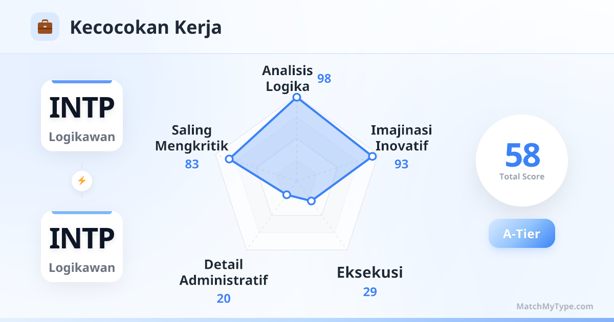 Kemampuan koreksi kesalahan yang ekstrem dan pemikiran inovatif. Seorang INTP mengajukan rencana, yang lain dapat seketika memindai celah logika melalui Ti dan memberikan perbaikan, serta memperluas solusi yang lebih optimal melalui Ne. Kecepatan iterasi ini sangat cepat, dan kedua pihak tidak akan merasa sakit hati karena didebat (selama alasan Anda masuk akal).