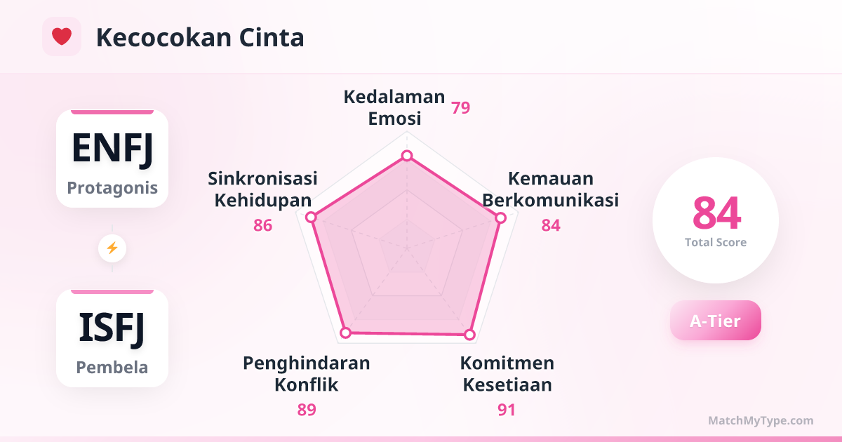 Kedua belah pihak menunjukkan perhatian yang luar biasa. ENFJ merencanakan kencan, ISFJ menyiapkan bekal piknik. Keduanya akan kagum pada pengertian dan keandalan satu sama lain, merasa telah menemukan pasangan sempurna untuk menjalani hidup bersama.