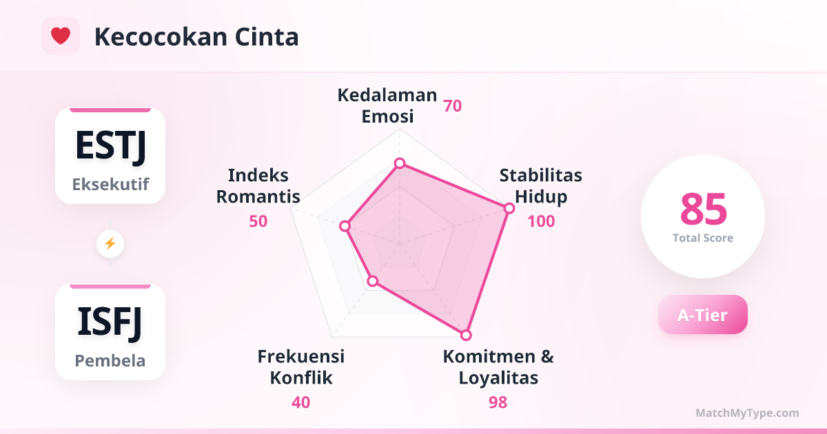 Hubungan ESTJ x ISFJ yang matang seperti perusahaan yang dikelola dengan baik. ESTJ bertanggung jawab atas arah kemudi dan persaingan eksternal, ISFJ bertanggung jawab atas pemeliharaan internal dan pelumas emosional. Kedua pihak telah menerima perbedaan karakter masing-masing dan membangun kasih sayang mendalam ala rekan seperjuangan.