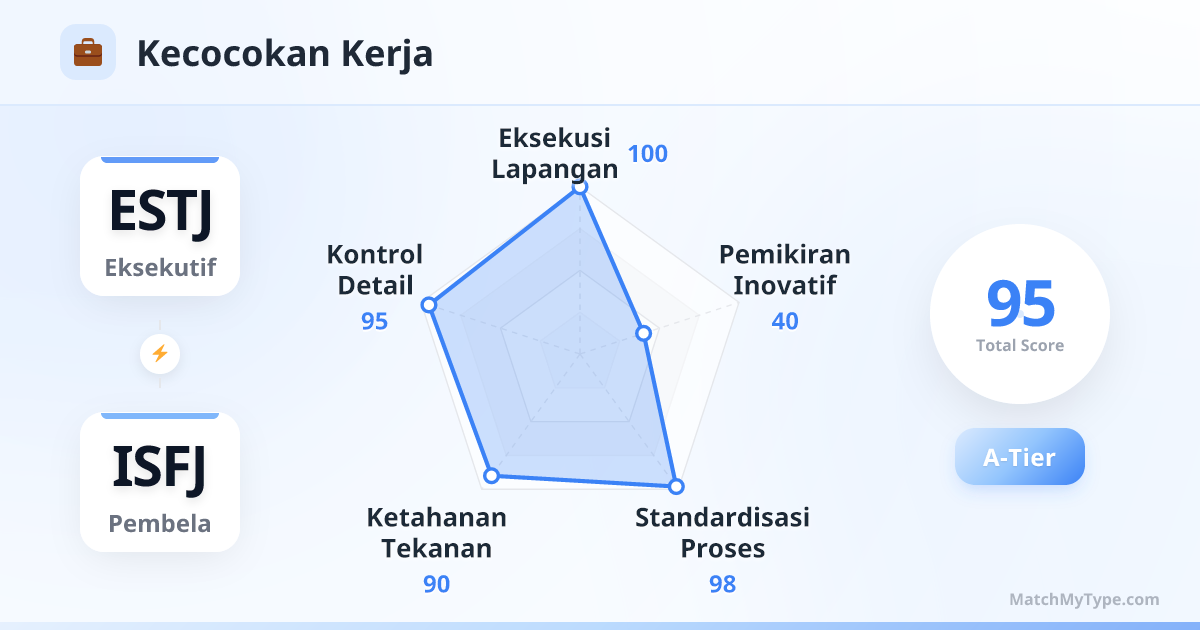 Siklus eksekusi yang ekstrem. ESTJ ahli dalam menyusun strategi, mengalokasikan sumber daya, dan menetapkan KPI; ISFJ ahli dalam memperhatikan detail, menjaga keharmonisan tim, dan memastikan output yang berkelanjutan. ESTJ berani berperan sebagai pihak yang tegas untuk mendorong reformasi, ISFJ pandai berperan sebagai penengah untuk menenangkan hati orang. Di bidang administrasi, keuangan, medis, pendidikan, atau manajemen proyek, ini adalah konfigurasi yang paling aman.
