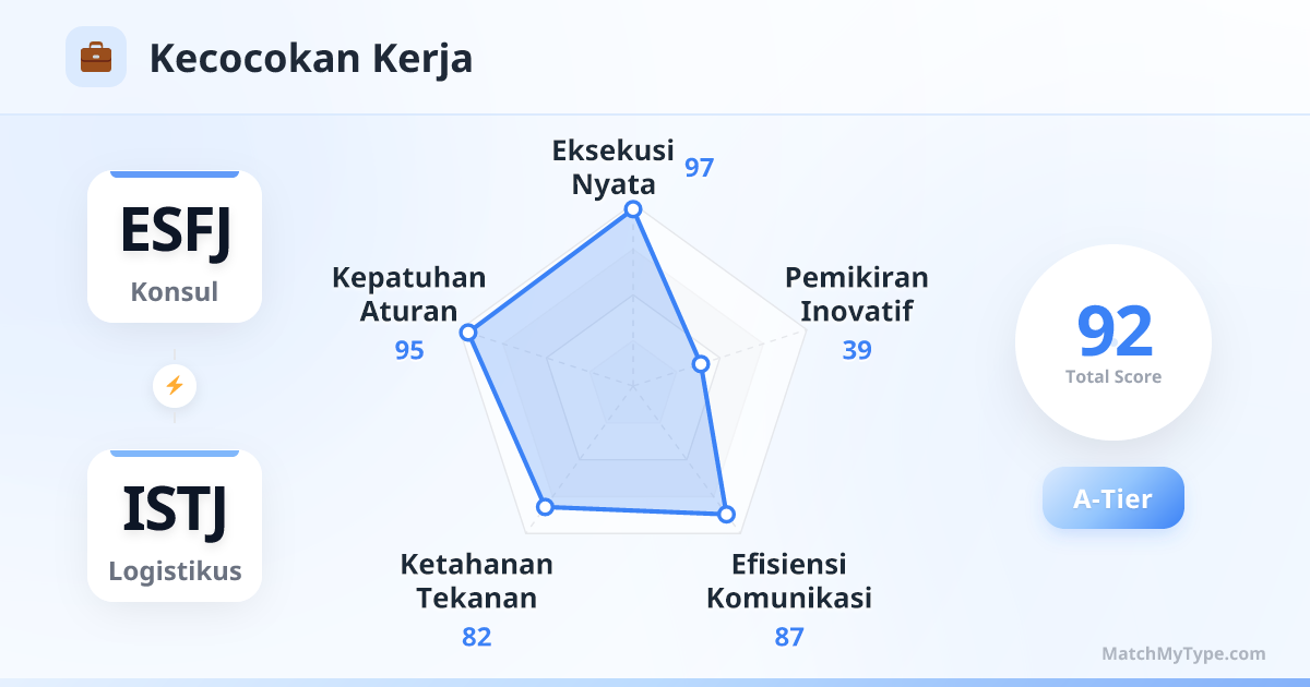 Ini adalah 'kombinasi eksekusi' yang paling menenangkan di tempat kerja. Jika ENFP dan ENTP bertanggung jawab untuk membuat visi, maka ESFJ dan ISTJ adalah orang-orang yang bertanggung jawab untuk mewujudkan visi tersebut. Kalian adalah fondasi perusahaan, penjaga proses, dan sinonim dari kemampuan eksekusi.