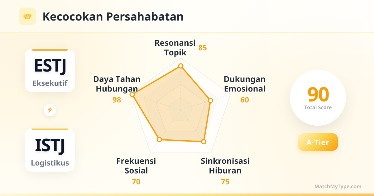 Ini adalah kenyamanan dari 'mengenali jenis yang sama'. Kedua belah pihak termasuk dalam kamp Penjaga SJ, berbagi sistem bahasa yang sama: menghormati tradisi, mementingkan fakta, dan mengutamakan efisiensi. ESTJ mengagumi ketenangan, ketelitian, dan keandalan ISTJ, merasa akhirnya menemukan seseorang yang bisa mengelola 'garis belakang' dengan teratur; ISTJ mengagumi keberanian, ketegasan, dan kepemimpinan ESTJ, merasa pasangan bisa memberikan arah dan perlindungan yang jelas bagi kehidupan. Kalian tidak perlu saling menjelaskan mengapa 'tepat waktu' itu penting, karena itu adalah prinsip dasar kalian berdua.