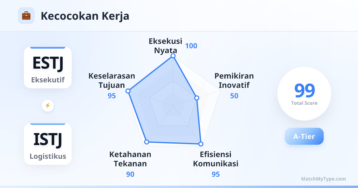 Kombinasi sempurna antara 'front-end dan back-end'. ESTJ ahli dalam menyusun strategi, negosiasi eksternal, dan koordinasi gambaran besar; ISTJ ahli dalam memeriksa detail, kontrol proses, dan manajemen risiko. ESTJ berani maju menyerang, ISTJ memastikan logistik aman. Di bidang keuangan, hukum, teknik, dan administrasi yang membutuhkan ketelitian dan aturan, kalian tak terkalahkan.