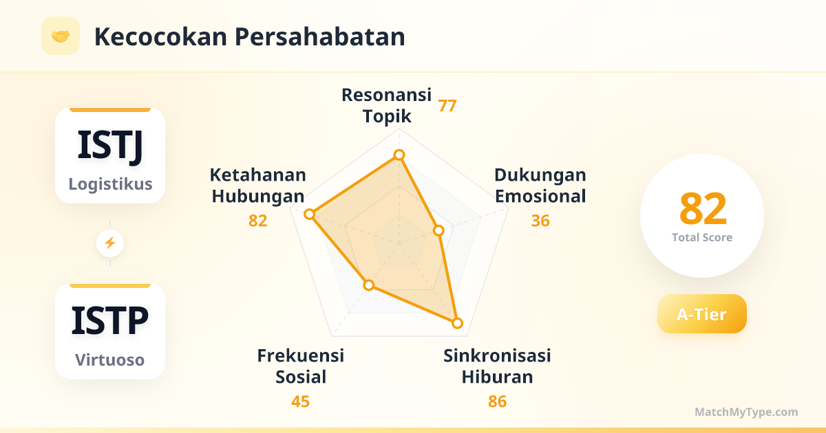 Kecocokan sempurna dalam mode hemat energi. Keduanya introvert (Introverted), tidak suka pesta yang berisik dan sosialisasi yang tidak efektif. Saat bersama, kalian bisa tidak bicara dalam waktu lama sambil bermain ponsel masing-masing tanpa merasa canggung sedikit pun. Kemampuan untuk 'menyendiri bersama' ini adalah fondasi persahabatan jangka panjang kalian.