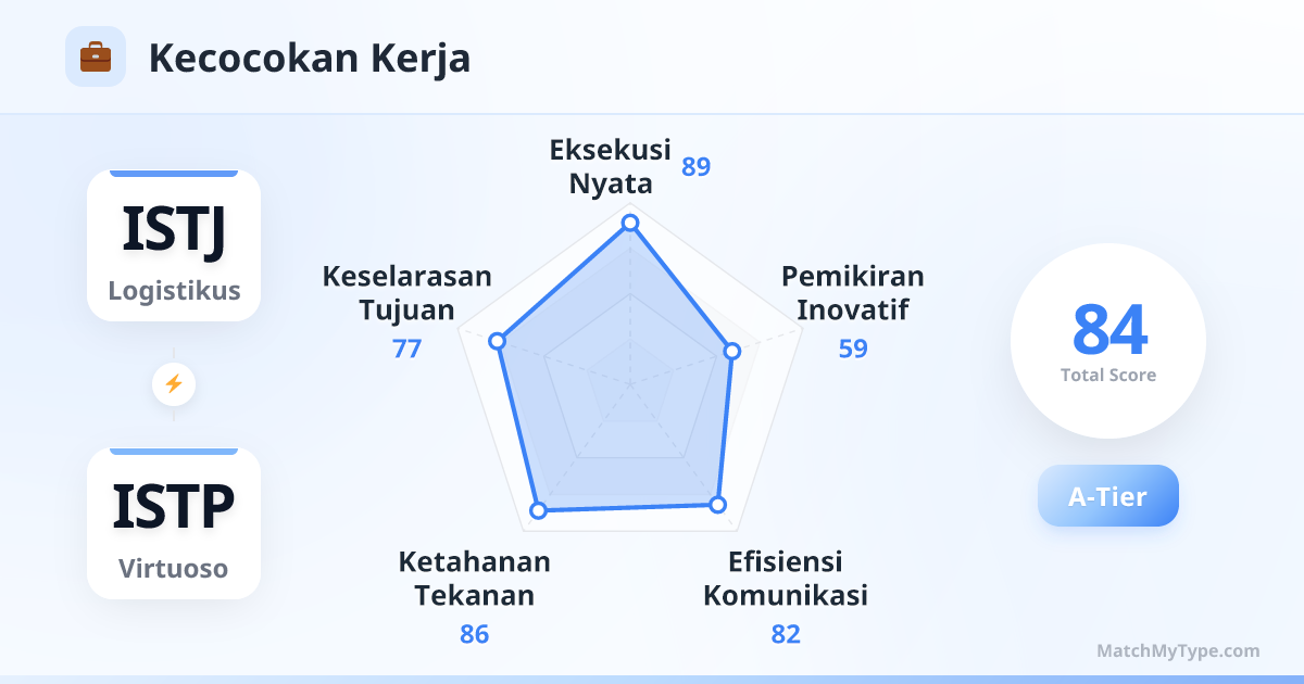 Kombinasi sempurna antara proses dan teknologi. ISTJ mahir membangun SOP (Standard Operating Procedure), mengelola jadwal, dan anggaran; ISTP mahir memecahkan masalah teknis dan mengoptimalkan langkah operasi spesifik. Di bidang seperti teknik, IT, bedah, atau manajemen risiko keuangan yang butuh ketelitian dan fleksibilitas, kalian adalah partner emas.