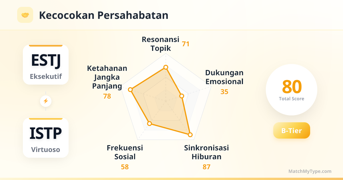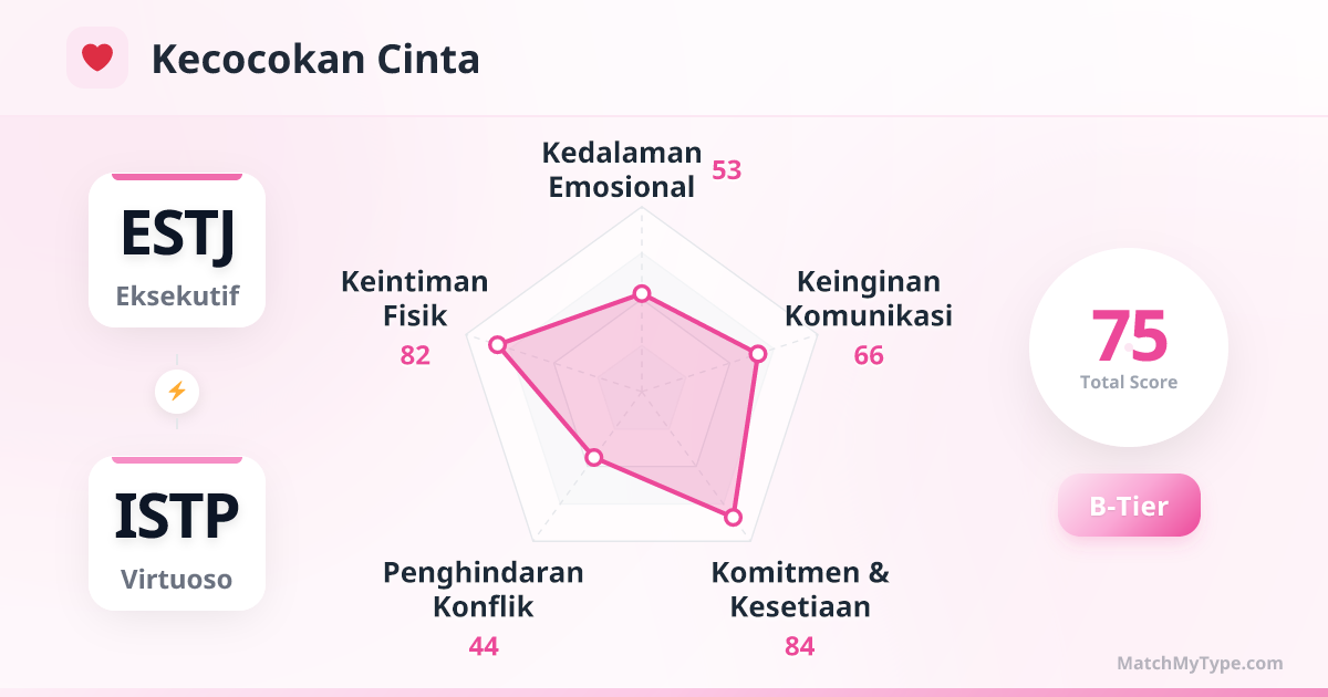 Ini adalah 'Dream Team' di tempat kerja. ESTJ menyediakan struktur, sumber daya, dan manajemen, sementara ISTP menyediakan teknis, strategi, dan eksekusi. Selama ESTJ tidak melakukan manajemen mikro terhadap langkah kerja spesifik ISTP, kalian bisa mencapai KPI apa pun.