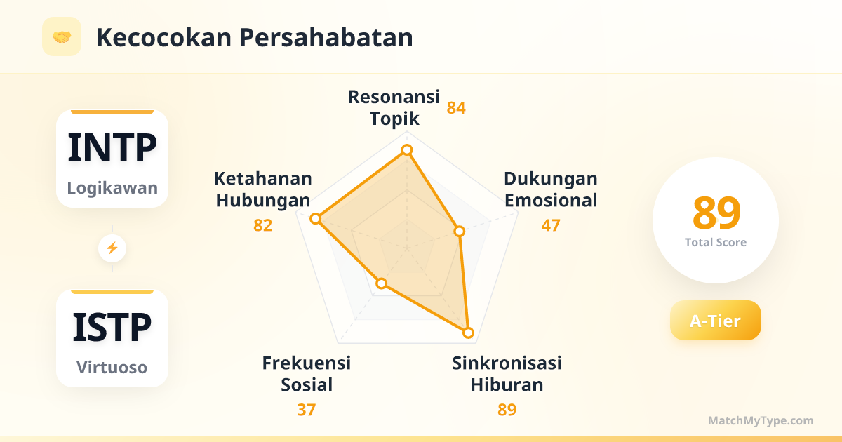 Status yang paling nyaman adalah 'bermain secara paralel'—INTP membaca buku, ISTP merakit model di sampingnya, keduanya tidak bicara selama dua jam tetapi tetap merasa dekat. Kalian belajar menghargai keahlian masing-masing tanpa memaksa pasangan untuk masuk ke saluran kalian.
