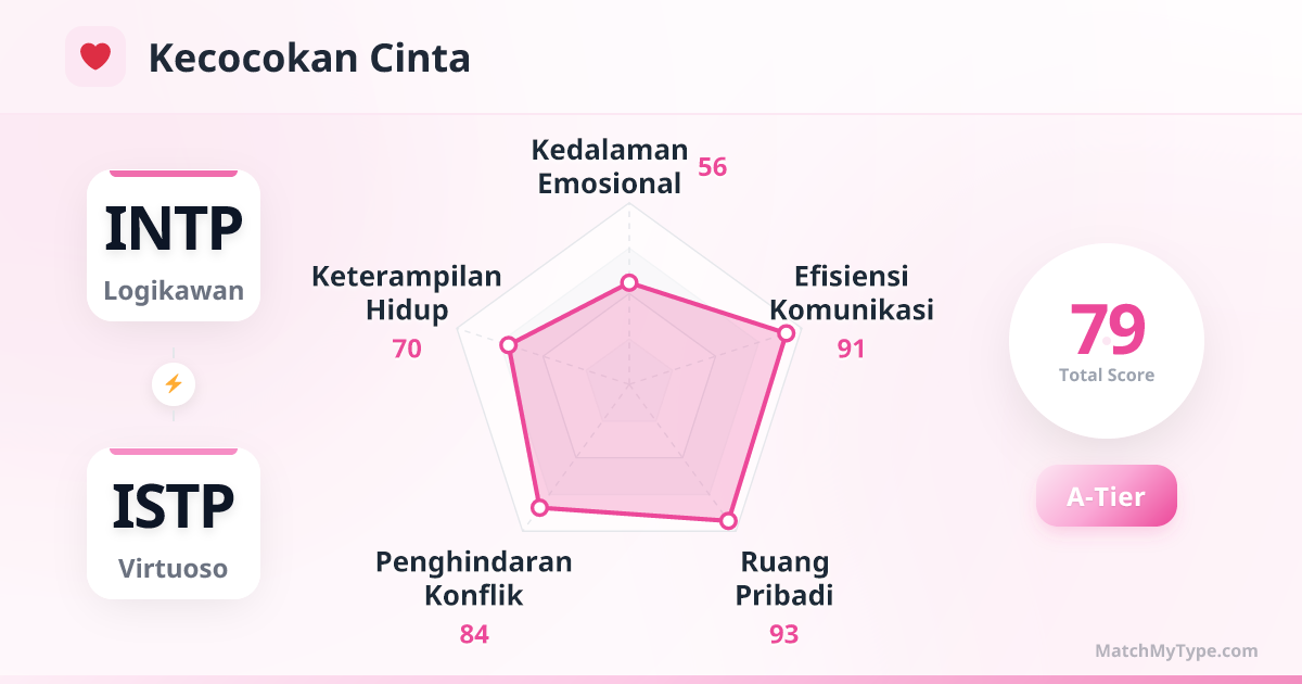 Ini adalah hubungan yang sangat 'tenang' tetapi memiliki inti yang kokoh. Baik INTP maupun ISTP tidak menyukai klise romantis duniawi; tidak ada bunga atau lilin, yang ada hanyalah saling berbagi tautan informatif dan kekompakan saat bermain game bersama. Kalian adalah pasangan yang paling tidak melelahkan bagi satu sama lain, karena di dunia ini, hanya pasangan kalian yang bisa mengerti 80% penjelasan latar belakang yang kalian hilangkan.