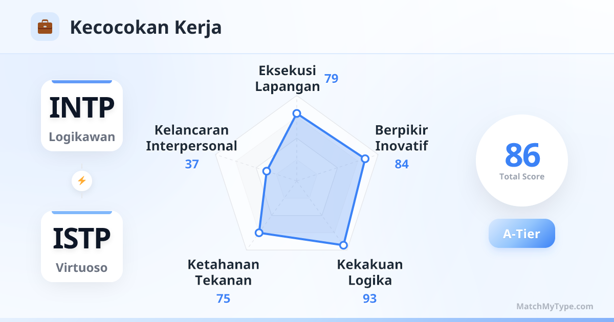 Lingkaran tertutup yang sempurna antara teori dan praktik. INTP pandai menemukan celah logika sistemik dan mengusulkan solusi optimal; ISTP pandai menggunakan alat yang ada untuk memperbaiki gangguan di depan mata dengan cepat. INTP menunjukkan arah, ISTP membuka jalan. Di bidang pemrograman, teknik, bedah, atau investigasi, tingkat kecocokannya sangat tinggi.