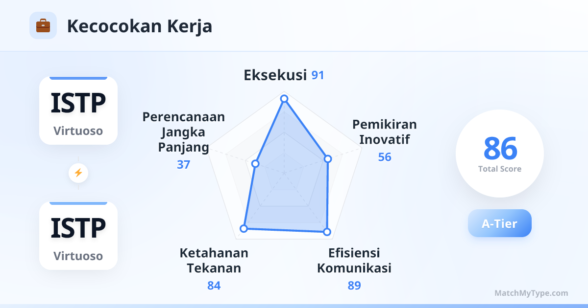 Jika perlu membentuk "pasukan khusus" untuk menyelesaikan kegagalan teknis atau krisis mendadak, dua ISTP adalah konfigurasi sempurna. Anda sedikit bicara, tangan cepat, tenang, dan logis secara ketat. Namun jika diminta menulis PPT perencanaan strategi tahunan bersama, itu akan menjadi bencana.