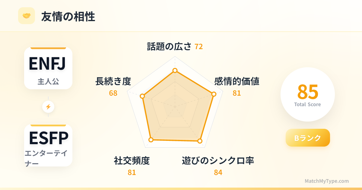 - 1**深さのミスマッチ**:ENFJが人生哲学を語りたい時に、ESFPはトレンドの噂話しかしたくない。ENFJはESFPに形而上学的な話を強要せず、Ni/Neを持つ友人と語り合うことでバランスを取りましょう。