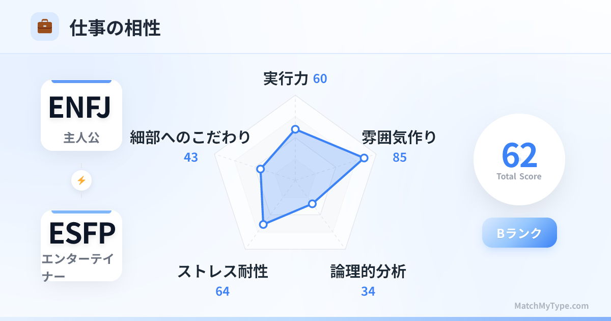 圧倒的な感染力。ENFJはビジョンを描き人心を掌握するのが得意で、ESFPは雰囲気を明るくし具体的な対人交渉をこなすのが得意です。プレゼンや資金調達、チームビルディングにおいて、ENFJがステージで話し、ESFPがフロアで交流するスタイルは無敵です。