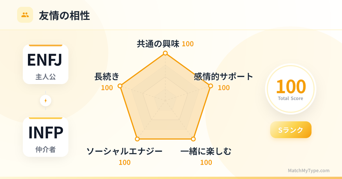 半年間連絡を取らなくても、会えば一晩中語り合えるような知己です。ENFJはINFPを家から連れ出して世界を見せる役割を担い、INFPはENFJを立ち止まらせて内面を見つめさせる役割を担います。浮ついた世界の中で、あなたたちは互いにとっての精神的な避難所です。