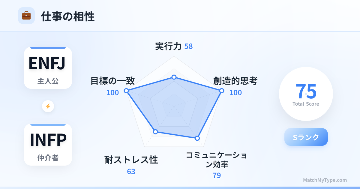 物理的な隔離が効率維持の鍵です。隣同士に座ると、一日中人生哲学を語り合って仕事を忘れてしまうかもしれません。明確な分担を推奨します。ENFJは対外的なピッチ、クライアント対応、部門間調整を担当し、INFPは内部での製品の磨き上げ、コピーライティング、ビジュアルデザインを担当します。厳密な論理が必要なデータ分析業務を一緒に行うのは避けましょう。