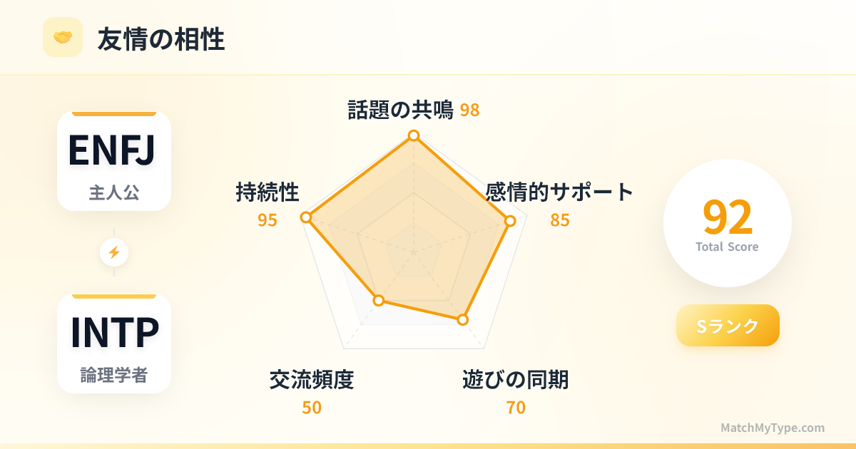 正反対です。ENFJは社交で充電し、INTPは一人で充電します。友人として、ENFJはINTPの「社交の盾」となり、パーティーでの退屈な挨拶を肩代わりしたり話題を振ったりします。INTPはENFJの「バックヤード」となり、ENFJが維持しなければならない人間関係の愚痴を聞いてあげます。