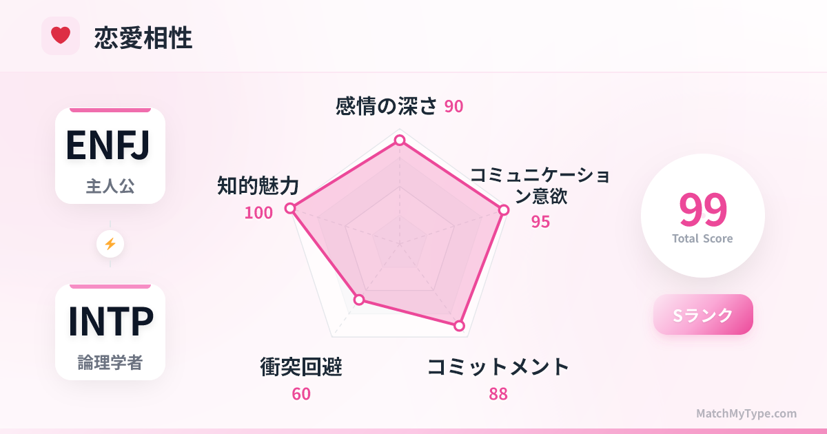 MBTI理論における有名な「ゴールデンペア(Golden Pair)」。ENFJはINTPが渇望しながらも不器用な「温かな社交性」を持ち、INTPはENFJが尊敬しながらも欠けている「緻密な論理性」を持っています。これは「欠落の補完」に基づく強烈な引力であり、ENFJはこの賢い「世間知らず」を世話したいと思い、INTPはこの温かな「謎」を研究したいと思うのです。