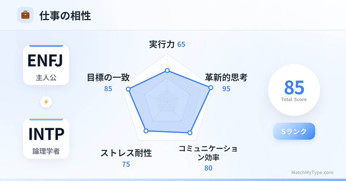 これは「プロダクトマネージャー」と「チーフアーキテクト」の黄金コンビです。ENFJは空気を読み、チームを管理し、ビジョンを売り込むのが得意です。INTPはシステムを構築し、欠陥を見つけ、技術的難題を解決するのが得意です。役割分担さえ適切なら、無敵です。
