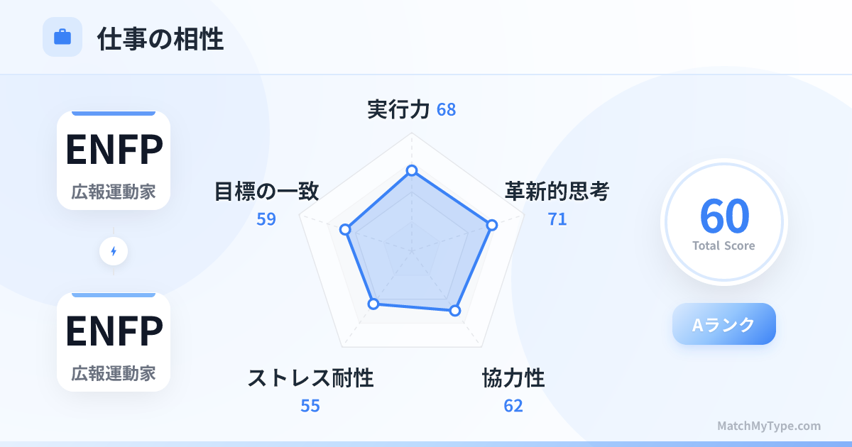 ブレインストーミング会議なら無敵のドリームチームですが、月末の経費精算やプロジェクトの進捗管理となると、大惨事の現場になるかもしれません。ENFP x ENFPの仕事コンビはインスピレーションに溢れていますが、実行力が極めて不足しています。