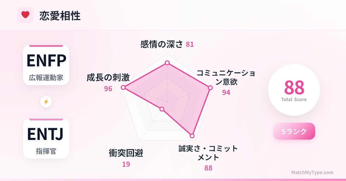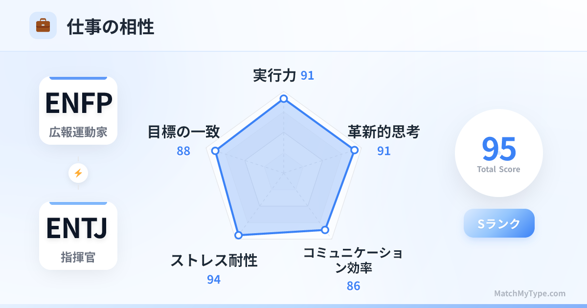 これはMBTI宇宙において最強の「稼ぐコンビ」の一つです。ENFPは最高のプロダクトマネージャーやクリエイティブディレクター、ENTJは最高のCEOやプロジェクトマネージャーになります。二人が衝突さえしなければ、落とせないプロジェクトはありません。