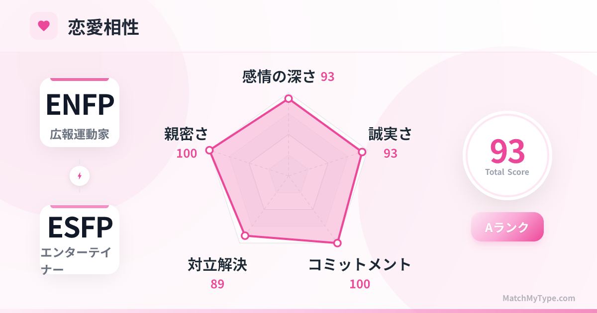 ダブルの外向型(E)です。ENFPは「お祭り騒ぎ」が好きで、ESFPは「ステージの中心」です。二人が揃えば巨大なエネルギー場が生まれ、どんなに冷え切った場も盛り上げることができます。ただし、ENFPは実は「最も内向的な外向型」であり、突然帰宅して一人で充電したくなることがあります。ESFPは「盛り上がってるのになんで?」と困惑せず、ENFPの断続的な社交不安を理解してあげましょう。