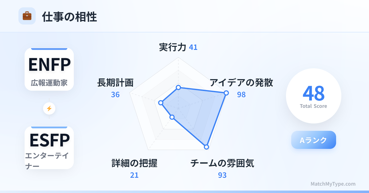 この二人は「知行合一」を補完し合える学習相手です。 **ENFPがESFPから学ぶこと**: 脳内の幻想から抜け出し、今の温度、香り、色彩をリアルに感じること。批判せずに人生を楽しむこと。思い立ったらすぐ行動する力。 **ESFPがENFPから学ぶこと**: 現象の背後にある本質を見抜くこと。未来のために少しだけ計画を立てること。物事の深い繋がりや意味を理解すること。