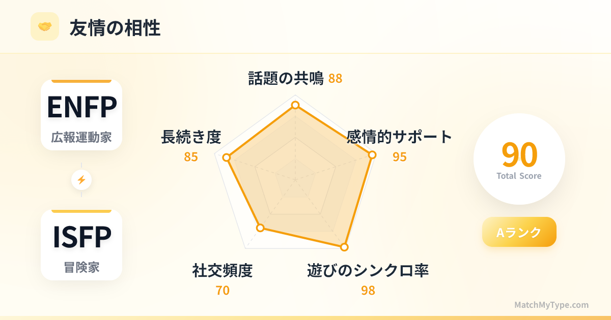 **社交ニーズの差**: ENFPは社交で充電しますが、ISFPの社交エネルギーは低めです。ENFPが無理にISFPをパーティーに連れ回すとISFPは崩壊し、逆にISFPに合わせすぎるとENFPは窮屈さを感じます。