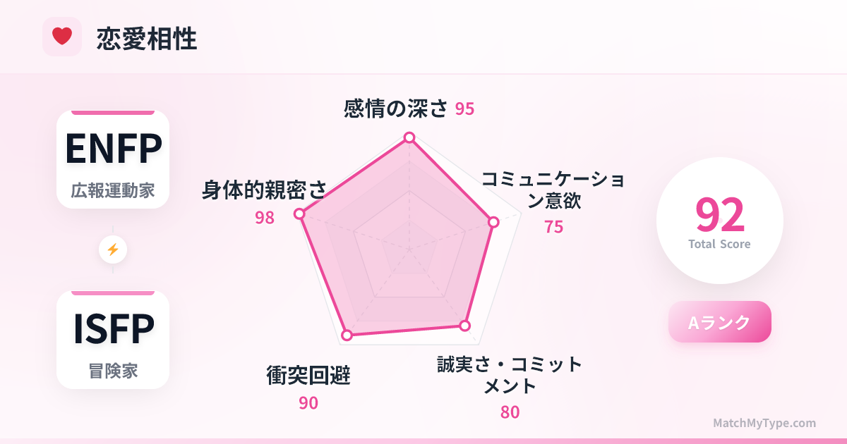 **回避型コンフリクト**: 二人とも衝突を嫌う(Fi)ため、問題が起きると逃避したり冷戦状態になったりしがちです。ENFPは冗談で不満を隠し、ISFPは黙り込みます。問題が蓄積すると爆発します。