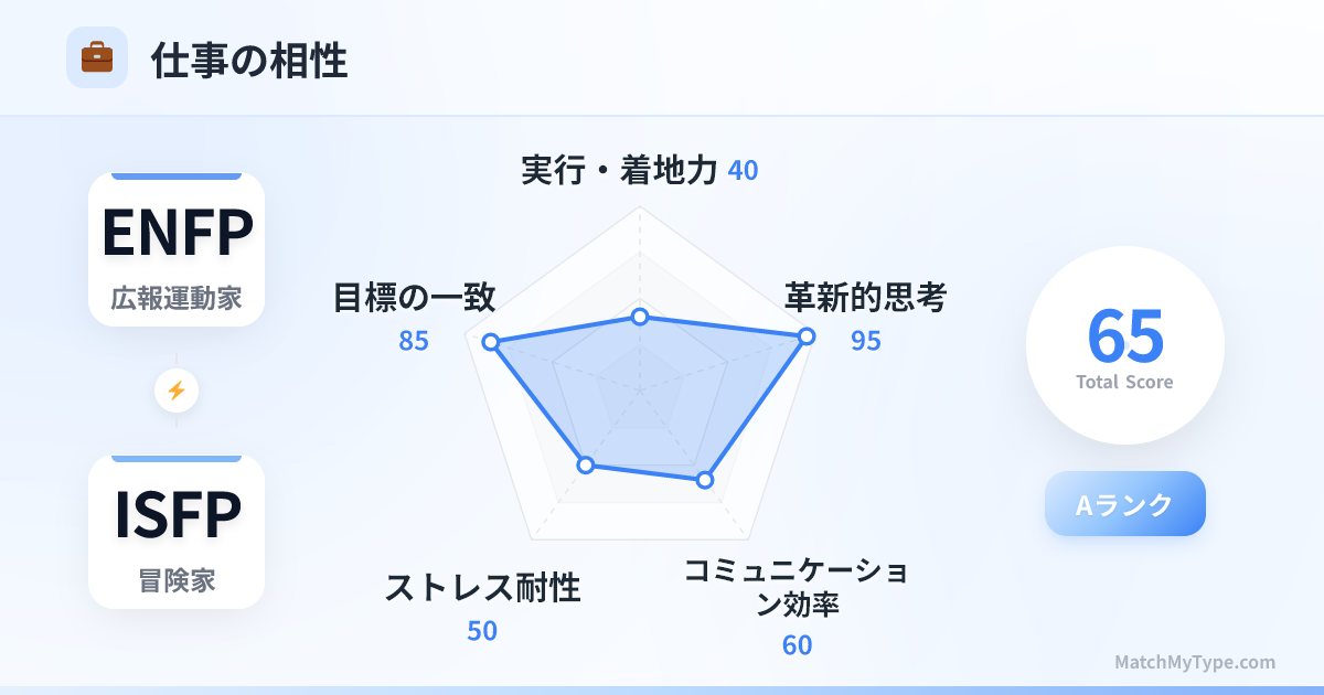 ISFPは穏やかで、ある種「悟り」を開いたような上司です。マイクロマネジメントはしませんが、明確な戦略的指針に欠けることがあります。部下のENFPは方向性を見失ったり、上司に「ハングリー精神」が足りないと感じたりするかもしれません。ENFPが主体的に計画を提案し、承認を得る形がベストです。
