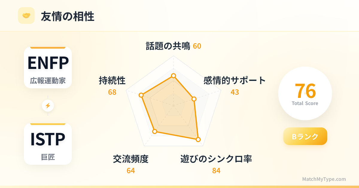 「一緒に遊べるだけでなく、一緒に悪巧みもできる」ような悪友コンビです。ENFPの突飛なアイデアとISTPの実行力が合わされば、素晴らしい冒険(あるいはちょっとしたトラブル)が待っています。