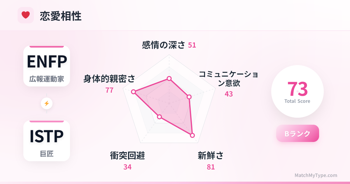 - 3**コミットメントへの恐怖**:ENFPは未来を計画(Ne)したがりますが、ISTPは今を生きたい(Se)のです。ENFPが「結婚や家の購入」を迫ると、ISTPは躊躇し、ENFPを極度に不安にさせることがあります。