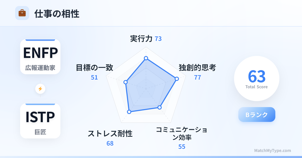 補完的ですが、分離が必要です。ENFPが外部とのコミュニケーションやブレインストーミングを担当し、ISTPが内部の実行や技術的な詰めを担当します。会議ではENFPが雰囲気を盛り上げ、ISTP(または第三者のJ型)が議事録作成や締め切りの設定を行うようにしてください。そうしないと、楽しく喋っただけで何も決まらない可能性があります。
