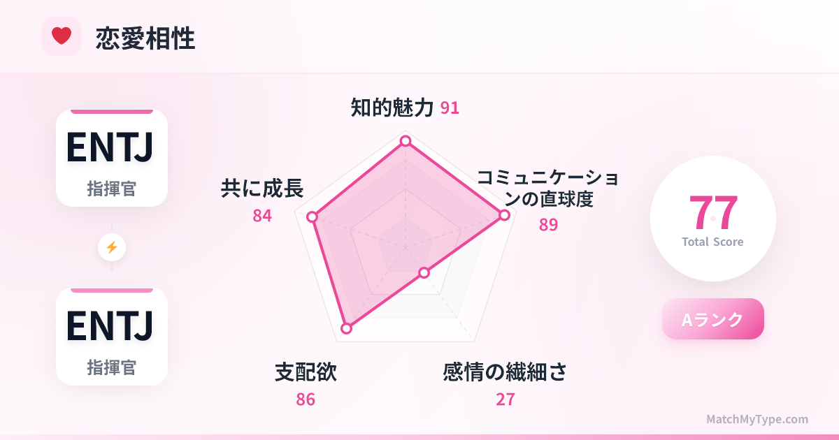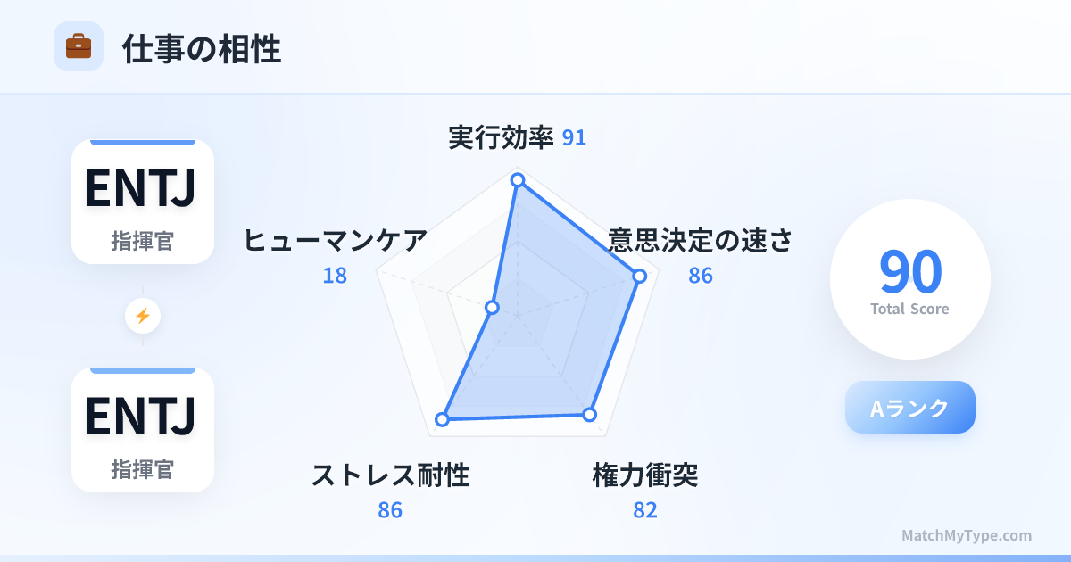 ENTJ x ENTJがチームを組めば、それは特殊部隊です。効率、実行力、戦略的視点はすべて満点。唯一の敵は内部の権力争いと、異なる意見に対する許容度です。