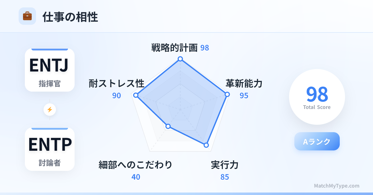 0から1、そして100への全プロセスをカバーできます。ENTPは無から有を生み出し、破壊的なコンセプトを提案する(0から1)のが得意です。ENTJは戦略を練り、そのコンセプトを複製可能なビジネス帝国へと変える(1から100)のが得意です。ENTPは軍師、ENTJは元帥です。