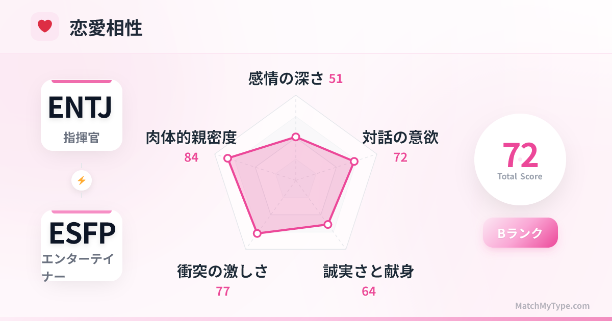 表面上は、社交の中心にいるESFPの方が誘惑が多いように見えます。しかし実際には、ESFPのFi(内向的感情)は一度真実の愛を決めると、内面的には非常に忠実です。むしろENTJの方が、パートナーが自分の成長についてこれないと判断した場合、より理性的かつ冷酷に、関係を継続すべきか天秤にかけることがあります。したがって、この関係の不安定さは「浮気心」よりも「価値観の不一致」から生じることが多いです。